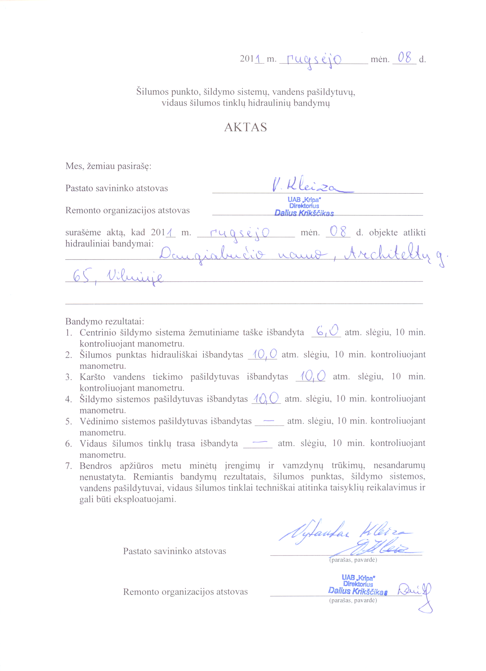Vakar, t.y. rugsėjo 08 d., kartu su UAB Kripa, sėkmingai atlikome mūsų namo šilumos punkto hidraulinius bandymus. Šio mėnesio antroje pusėje planuojame galutinį šilumos punkto paruošimą kartu su Vilniaus energijos atstovu. Atliktų darbų aktą galite pamatyti čia: hb aktas 002.png